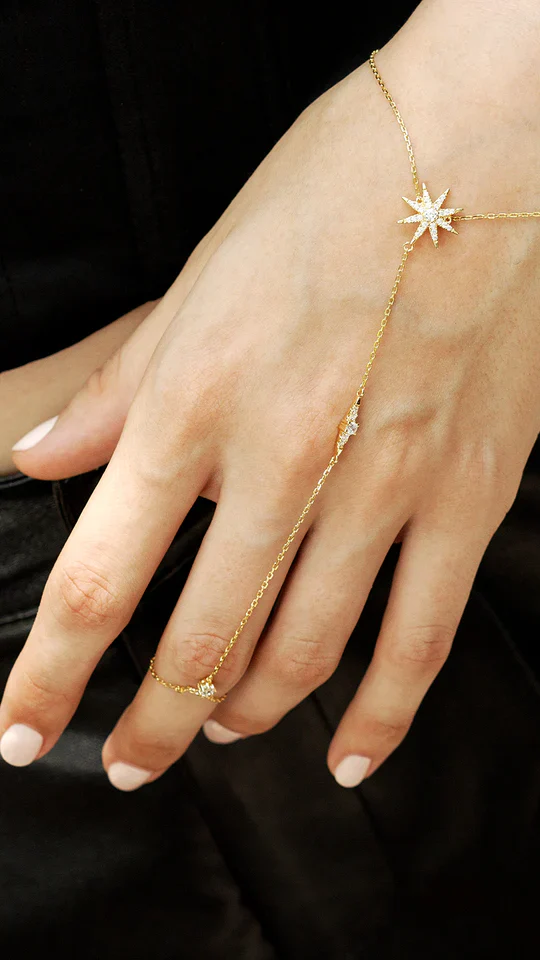 Discover the beauty of our one-of-a-kind hand jewelry, crafted with silver and finished with a gold plating. Adorned with sparkling zircon stones, this piece combines a touch of luxury with modern style. The elegant design and shiny gold details make it a standout accessory for any occasion. Perfect for adding a unique and sophisticated touch to your look
